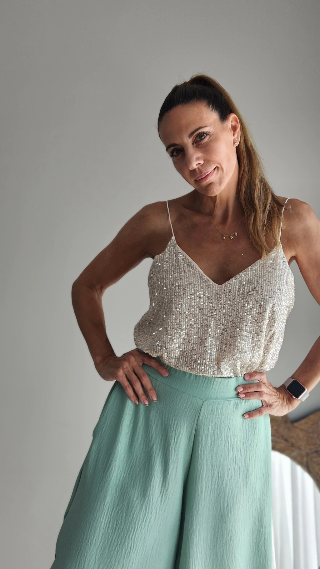 Dale un giro a tu guardarropa con nuestra Musculosa de lentejuelas con forro. Este diseño deslumbrante, con breteles de cola de ratón, es perfecto para elevar cualquier outfit.