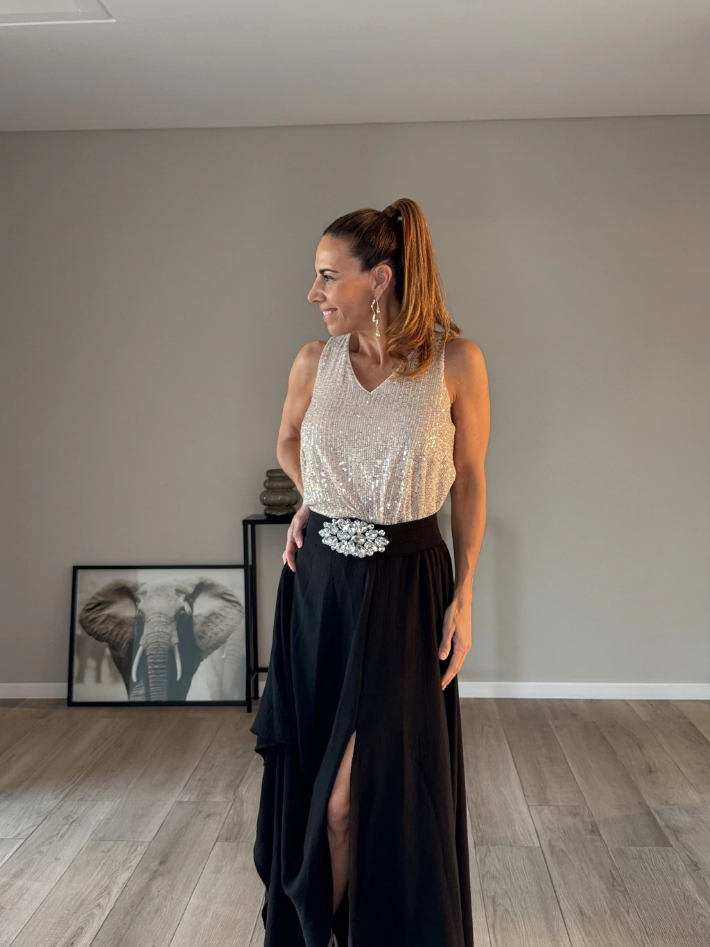 La Musculosa de lentejuelas Viena es la elección perfecta para destacar en cualquier evento. Su diseño viene con forro cómodo, el cuello en V y un delicado botón en la espalda. La caída con vuelo añade un toque de sofisticación, asegurando que estés impecable en cada ocasión.